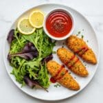 A white plate on a white marbled surface holds three golden-brown breaded chicken tenders arranged in a slightly overlapping row on the right side. Each tender has a crispy texture with herbs sprinkled on top, and the middle one is drizzled with a reddish sauce. On the left side of the plate, there is a fresh mixed green salad with different shades of green and purple leaves, alongside two thin lemon slices placed near the top. Above the chicken tenders is a small white bowl filled with bright red dipping sauce sprinkled with black pepper. Photo taken with an iphone --ar 4:5 --v 7