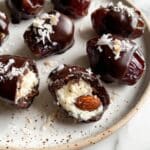 - Stuff the Dates: Using about 1/2 tablespoon of the coconut mixture, stuff each pitted date generously. Gently press one roasted almond into the center of each stuffed date to add a crunchy surprise.