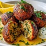 The image shows five round, golden-brown fried balls with a slightly crispy texture placed on a white plate. Four whole balls are arranged in a cluster, and one ball is cut in half in the front, revealing a soft, moist, and spiced filling with green herbs mixed in. The balls are sprinkled with fresh green herb leaves on top, and they sit in a shallow layer of light golden sauce that has small herb pieces scattered around. A slice of bright yellow lemon is placed at the back on the plate, next to a dollop of white sauce with herb bits. The white plate is set on a white marbled surface with soft natural light highlighting the rich colors of the dish photo taken with an iphone --ar 4:5 --v 7