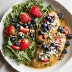 This Balsamic Chicken with Fresh Berries, Spinach, and Feta is a vibrant, flavor-packed skillet dish featuring tender seared chicken breasts in a tangy balsamic sauce, fresh spinach, and sweet berries. Enhanced with garlic, herbs, and a touch of honey, it’s garnished with crumbled feta cheese, arugula, and glazed nuts for a perfect balance of savory and sweet.