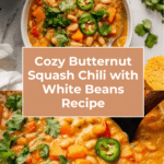 This hearty and nutritious Butternut Squash Chili with White Beans is a flavorful vegan dish perfect for cozy dinners. Featuring tender butternut squash, creamy navy beans, and a blend of spices including smoked paprika and cumin, it is enhanced with a toasty depth from nutritional yeast and freshness from cilantro. Simmered on the stovetop with vegan broth, this chili is comforting, filling, and free from animal products.