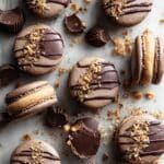 Delight in these elegant Chocolate Peanut Butter Macarons, featuring delicate cocoa-infused almond meringue cookies sandwiched with a rich and creamy peanut butter filling. A perfect treat combining the smoothness of Swiss meringue with the bold flavors of chocolate and peanut butter, ideal for special occasions or a luxurious dessert at home.