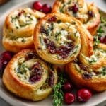 Cranberry Cream Cheese Pinwheels with Feta & Herbs are delightful, flaky appetizers featuring a creamy blend of cream cheese, tangy feta, fresh herbs, and sweet-tart cranberries rolled inside puff pastry. Perfect for holiday parties or any gathering, these bite-sized treats bake to golden perfection and offer a delicious balance of flavors.