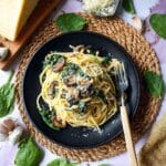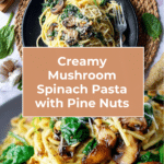 Keywords: Creamy mushroom pasta, spinach pasta, linguine recipe, vegetarian pasta, easy pasta recipe, pine nuts pasta, Parmesan pasta sauce