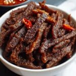 A white bowl filled with many dark brown strips of sticky, glossy meat arranged in a heap, with visible pieces of sliced red chili peppers mixed in, creating a shiny and textured look. Behind the bowl, a small portion of another bowl with a red sauce topped with white seeds is partially visible, all set on a white marbled surface. photo taken with an iphone --ar 4:5 --v 7