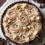 A tart with a dark brown crumbly crust forms the base, pressed into a scalloped white tart pan. On top, a creamy light brown layer is decorated with large swirls and smaller star-shaped dollops of frosting, all textured with subtle specks that hint at spices. The swirls fill most of the surface in a circular pattern, with the stars filling the spaces between. The tart sits on a white marbled surface scattered with shiny, dark brown coffee beans around the edges. photo taken with an iphone --ar 4:5 --v 7