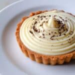 The image shows a small tart placed on a white plate with a white marbled surface beneath. The tart has a golden brown crust that looks crisp and slightly textured. On top of the crust is a smooth, creamy white layer arranged in a spiral pattern, starting wide at the outer edge and becoming narrower towards the center where it peaks in a small swirl. Tiny dark brown flakes are sprinkled over the white cream, adding contrast and a hint of texture. The lighting highlights the smoothness of the cream and the rough edges of the crust. photo taken with an iphone --ar 4:5 --v 7