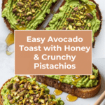 This easy avocado toast recipe is a quick and nutritious breakfast or snack option that combines creamy avocado, crunchy pistachios, a touch of sweet honey, and a dash of sea salt served on toasted bread. It’s simple to make, delicious, and packs healthy fats and protein to keep you energized.