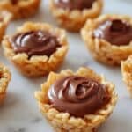- Top the Bites: Spoon the melted chocolate and butterscotch mixture over each Scotcheroo bite, spreading it evenly. Let the topping set at room temperature or refrigerate briefly until firm before serving.