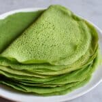 A stack of six thin, green crepes with a soft, slightly porous texture sits neatly on a white plate. The top crepe is partially folded over, showing its smooth, slightly shiny underside that contrasts with the tiny holes and uneven surface on top. The green color is vibrant and even throughout each crepe. The plate is set on a white marbled texture surface. photo taken with an iphone --ar 4:5 --v 7