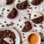 - Dip and Garnish: Dip half of each cooled cookie into the melted white chocolate, then place on parchment paper. Garnish each cookie with 1-3 coffee beans. Allow the white chocolate to set at room temperature or place cookies in the freezer for a few minutes for quicker setting.