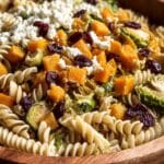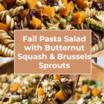 Keywords: Fall pasta salad, roasted butternut squash, Brussels sprouts salad, maple Dijon vinaigrette, autumn salad, vegetarian pasta salad