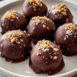 A white plate holds nine round chocolate truffles with a smooth dark brown chocolate coating. Each truffle is topped with small, golden-brown crunchy bits and a light sprinkle of white flakes. The chocolate coating shows small uneven textures around the base of some truffles. The plate rests on a white marbled surface, and the truffles are arranged closely, displaying a rich, glossy chocolate finish. photo taken with an iphone --ar 4:5 --v 7