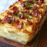 The image shows a thick rectangular loaf of layered sliced potato bake with a golden-brown crust on the edges and top. The top layer is textured with thin, crispy potato slices that have slightly browned, with small pieces of cooked bacon scattered evenly. There are hints of green chopped chives sprinkled lightly on top. The inside layers appear creamy and soft, showing smooth mashed potato texture stacked neatly inside the loaf. The loaf is set on a wooden board placed on a white marbled surface. Photo taken with an iphone --ar 4:5 --v 7