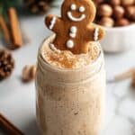 A clear glass jar filled with a thick, creamy, light brown drink speckled with darker brown spices, topped with a layer of frothy whipped cream dusted with cinnamon. A smiling gingerbread cookie decorated with white icing is placed upright into the whipped cream, standing out against the soft texture. The scene is set on a white marbled surface with blurred pinecones, cinnamon sticks, and a white cup of nuts in the background, giving a warm, cozy feel. Photo taken with an iphone --ar 4:5 --v 7
