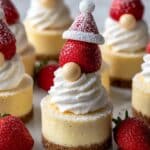 Gnome Mini Cheesecakes are adorable, festive bite-sized cheesecakes perfect for holiday celebrations. Featuring a buttery graham cracker crust and creamy cheesecake filling, these no-bake decorated treats are topped with fresh strawberries, whipped cream, and mini white chocolate chips to create charming gnome faces. Easy to prepare and delightfully festive, they make a perfect centerpiece or dessert for Christmas parties.