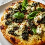 This Greek Roasted Garlic Spinach White Pizza is a savory and delightful Mediterranean-inspired dish featuring a crispy crust topped with a creamy roasted garlic and ricotta sauce, sautéed spinach, and a blend of three cheeses. Finished with fresh basil and a touch of spice, it’s a perfect vegetarian meal for any occasion.