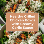 Keywords: grilled chicken bowl, broccoli bowl, creamy garlic sauce, healthy chicken recipe, grilled chicken with vegetables, easy dinner bowls, grain bowl, nutritious meal