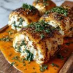 Herbed Ricotta Stuffed Chicken Rolls are a delicious and cozy dinner option featuring tender chicken breasts stuffed with a creamy mix of ricotta, fresh spinach, and fragrant herbs. Seared to golden perfection and baked in a savory marinara sauce, these flavorful rolls make for an impressive yet easy-to-make meal.