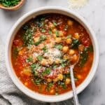 A comforting and hearty Italian Chickpea Soup featuring sautéed vegetables, fire-roasted crushed tomatoes, chickpeas, and fresh spinach, simmered to blend rich flavors and garnished with fresh basil and Parmesan cheese. This soup is perfect for a wholesome meal that’s both nourishing and satisfying.