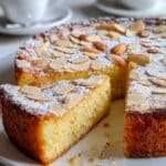 A round almond cake with a thick golden-brown crust and a moist, light yellow inside, cut to show its soft texture. The top layer is covered with toasted almond slices that are light brown and slightly crispy, dusted with white powdered sugar. The cake is on a white plate, sitting on a white marbled surface, with some crumbs and powdered sugar scattered around. In the background, there is a blurred white cup and saucer. photo taken with an iphone --ar 4:5 --v 7