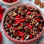 This festive Jingle Jangle Christmas Chocolate Snack Mix combines crunchy pretzels, sweet caramel corn, and cookies with rich melted chocolate and a drizzle of white chocolate, finished with mini peanut butter cups and colorful holiday M&M’s for a delightful holiday treat perfect for sharing or gifting.