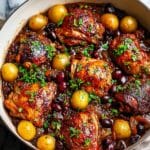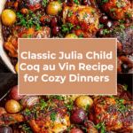 Julia Child’s Coq au Vin is a classic French comfort dish featuring tender chicken marinated and slow-cooked in a rich red wine sauce with bacon, mushrooms, pearl onions, and aromatic herbs. This recipe highlights a deep, layered flavor achieved through marinating and slow simmering in a Dutch oven, making it a perfect hearty meal for special occasions or cozy dinners.