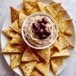 A white round plate is placed on a white marbled textured surface, filled with triangular pita chips arranged in a circular pattern around a small white bowl in the center. The chips are golden with green herb specks and a light grainy salt texture. Inside the bowl is a thick, creamy beige dip topped with dark purple halved olives neatly placed at the top. The dish contrasts the warm tones of the pita chips with the cool beige and dark purple of the dip and olives. Photo taken with an iphone --ar 4:5 --v 7