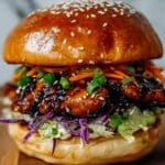 A delicious Korean BBQ Chicken Sandwich featuring juicy marinated chicken thighs grilled to perfection, topped with a vibrant zesty cabbage slaw, and served on buttery toasted brioche buns. This sandwich combines sweet, spicy, and tangy flavors for a satisfying and flavorful meal.