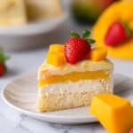 - Step 12: Garnish with fresh mango chunks and drizzle additional mango puree on top. Slice and serve.
