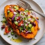 This Mediterranean Stuffed Sweet Potatoes recipe features perfectly roasted sweet potatoes loaded with a fresh, vibrant mixture of chickpeas, cherry tomatoes, cucumber, red onion, Kalamata olives, and feta cheese. Tossed in a zesty lemon garlic dressing with herbs, these stuffed potatoes make a nutritious, flavorful, and satisfying vegetarian meal ideal for lunch or dinner.