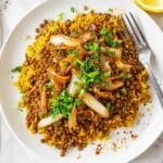 Mujadara is a classic Middle Eastern dish made with lentils, rice, and caramelized onions, offering a hearty, comforting, and flavorful vegan meal. This aromatic blend of spices and fresh herbs enhances the earthy lentils and fluffy rice, making it a perfect centerpiece dish served with tangy yogurt and lemon wedges.