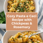 Pasta with Chickpeas (Pasta e Ceci) is a hearty and comforting Italian dish featuring tender chickpeas, short pasta, and flavorful rosemary simmered in a savory vegetable broth. This rustic soup combines simple pantry staples like garlic, onion, potato, and tomato paste with fresh herbs and olive oil for a nourishing meal that is perfect for any season.
