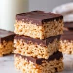 Keywords: Peanut Butter Rice Krispie Treats, no bake dessert, marshmallow treats, chocolate topped bars, easy kids snack, peanut butter dessert