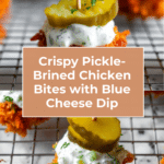 These Pickle-Brined Chicken Bites with a Creamy Blue Cheese Sauce are crispy, flavorful, and tangy. The chicken bites are marinated in pickle juice and dill, then coated in a crunchy cornflake crust and fried to golden perfection. Served with a rich blue cheese dip and garnished with pickle chips, they make a perfect appetizer or snack.