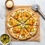 This Pickle Pizza recipe combines the tangy crunch of dill pickles with a creamy garlic sauce and melty cheeses on a crisp thin-crust pizza. The unique blend of flavors makes it a fun and unexpected twist on classic pizza, perfect for pickle lovers looking for a quick and easy homemade treat.