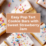 These Pop Tart Cookie Bars combine buttery sugar cookie dough layers with a sweet strawberry preserve filling and a classic powdered sugar glaze topped with rainbow sprinkles. Baked to golden perfection and then glazed, these bars are a delightful homemade treat reminiscent of nostalgic pop tarts, but in a convenient bar form perfect for sharing.