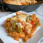This Queso Chicken Fajita Skillet is a flavorful and easy one-pan meal combining tender chicken, sautéed bell peppers, and onions, seasoned perfectly with fajita spices, then simmered with rice, tomato sauce, and chicken broth. Topped with creamy Gordo’s cheese dip, it delivers all the vibrant tastes of a classic Mexican restaurant dish in the comfort of your home.