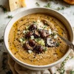 A white bowl filled with creamy brown soup, topped with a layer of small cooked mushrooms with a shiny dark brown texture, diced light green and white vegetables, and a sprinkling of white shredded cheese and fresh green thyme leaves. A silver spoon rests inside the bowl with some mushrooms on it. The soup surface is drizzled with golden olive oil and sprinkled with black pepper and herbs. The bowl sits on a beige cloth with fresh thyme nearby, and there is a piece of pale yellow cheese and two round sesame bagels blurred in the background on a white marbled surface. photo taken with an iphone --ar 4:5 --v 7