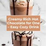 This rich and thick hot chocolate recipe for one is a decadent and cozy treat made with a blend of cocoa, espresso powder, milk, cream, and high-quality semisweet chocolate. It’s perfectly smooth, velvety, and topped with optional whipped cream for an indulgent single serving.
