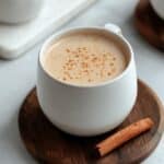 A white rounded cup filled with a light brown creamy drink topped with small orange-brown specks, sitting on a dark wooden coaster. Next to the cup on the coaster is a single brown cinnamon stick, all placed on a white marbled surface. In the background, a white marbled cutting board and another white cup are slightly visible. photo taken with an iphone --ar 4:5 --v 7