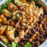5. Assemble the Bowls: Start by layering the crispy potatoes at the base of the bowl. Add the smashed beef on top, followed by the caramelized onions and shredded cheese. Drizzle the prepared Cajun mayo sauce over the top and finish with optional toppings like pickles and lettuce for additional texture and freshness.