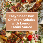 These Sheet Pan Chicken Kebabs with Lemon Tahini Sauce and Feta Salad make for a flavorful and easy weeknight dinner. Ground chicken is seasoned with warm spices, baked to perfection, and served alongside a fresh veggie salad and creamy tahini sauce. It’s a vibrant Mediterranean-inspired meal that comes together on one pan.