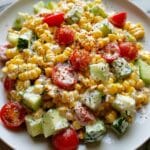 Shoepeg Corn Salad is a refreshing American recipe featuring a creamy dressing tossed with sweet white shoepeg corn, fresh cherry tomatoes, green peppers, and cucumbers. This crisp and flavorful salad is perfect as a side dish or a light meal, especially during warm weather.