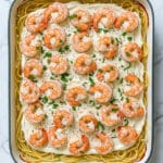 7. Assemble and Bake: Transfer the creamy pasta mixture to a 9×13-inch baking dish. Arrange the cooked shrimp on top, then sprinkle evenly with grated Parmesan and shredded mozzarella cheeses.