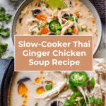 This Slow-Cooked Thai Ginger Chicken Soup Delight is a comforting and flavorful soup perfect for cozy days. Tender chicken breasts simmer slowly with aromatic ginger, garlic, and a medley of vegetables in a rich coconut milk and chicken broth base. Enhanced with lime juice, soy sauce, and optional red curry paste for a slight spicy kick, this soup offers a warming balance of sweet, savory, and citrusy flavors with a hint of Thai-inspired spice. It’s an easy crockpot recipe that requires minimal prep and yields hearty, aromatic soup that’s perfect for lunch or dinner.
