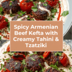 Spicy Beef Armenian Kefta is a flavorful and aromatic dish featuring seasoned ground beef shaped into logs or patties. Paired with creamy tahini and refreshing tzatziki sauces, it creates a perfect balance of spicy, tangy, and cooling flavors.