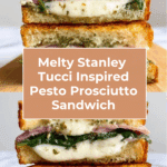 Stanley Tucci’s Favourite Sandwich is a deliciously melty and savory grilled sandwich featuring fresh mozzarella, grated cheese blend, prosciutto, and fresh basil pesto, all sandwiched between slices of crusty sourdough bread and pan-fried to golden perfection for a crunchy outside and gooey inside.