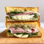 Stanley Tucci’s Favourite Sandwich is a deliciously melty and savory grilled sandwich featuring fresh mozzarella, grated cheese blend, prosciutto, and fresh basil pesto, all sandwiched between slices of crusty sourdough bread and pan-fried to golden perfection for a crunchy outside and gooey inside.