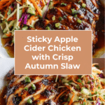 Keywords: apple cider chicken, sticky chicken, autumn slaw, crispy chicken, fall recipes, chicken thighs, healthy chicken dinner, apple slaw